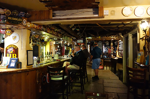 The pub had a great collection of beer mats on the ceiling and around the bar.